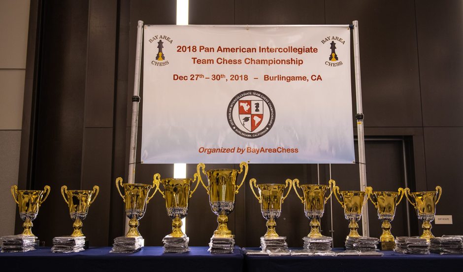 The Pan-American Intercollegiate Team Chess Championship, the crown jewel of college chess in the USA, is historically played in the days between the Christmas and New Year’s holidays, December 27th to 30th. The competition is open to chess teams from post-secondary schools in North America, Central America, South America, and the Caribbean. This year’s Pan-Am featured 230 players competing on 53 teams, a slight decrease from last year’s 58 teams. Each Pan-Am team had four players (called “four boards”) and up to two alternates. At the end of six rounds in San Francisco, four of the U.S. schools qualified for the President’s Cup, to be held April 6th-7th, 2019, at the Marshall Chess Club in New York City: Webster University – the winner of the 2018 PanAms – The University of Texas at Dallas, The University of Texas Rio Grande Valley and – surprise surprise! – Harvard University!