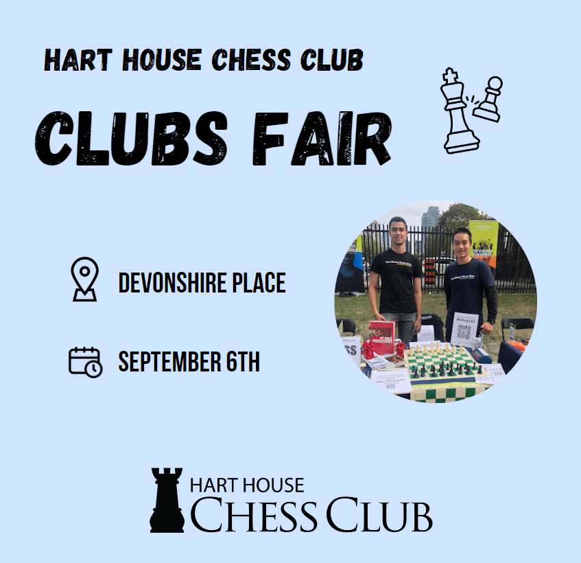 As September approaches, which marks the inception of another fresh academic year, the Hart House Chess Club is thrilled to announce that we will be joining the UofT Student Union’s Clubs Fair on Wednesday, September 6th. The Club looks forward to welcoming new and returning students from various chess skill levels and to promote the upcoming chess events at the Club this year.