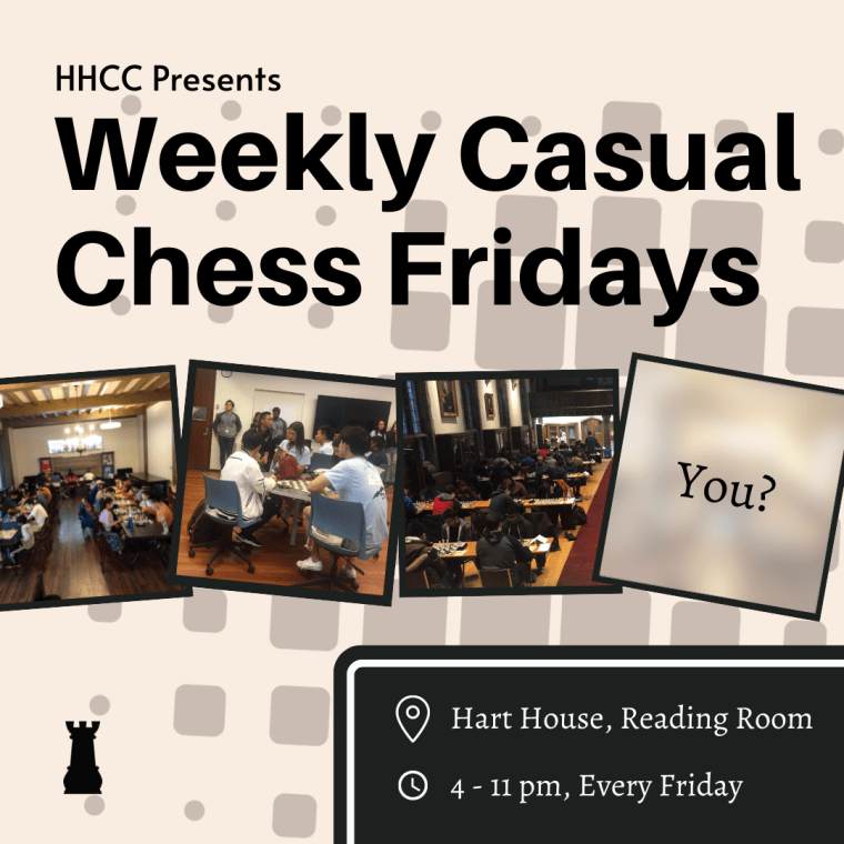 The Hart House Chess Club is open every Friday from 4 pm – 11 pm in the Hart House Reading Room. We are the only chess club in Toronto offering free casual drop-in play for all levels. Every Casual Play Friday is overseen by an Executive of the Hart House Chess Club, who will be happy to assist you in any way. Please stop by and pay us a visit!