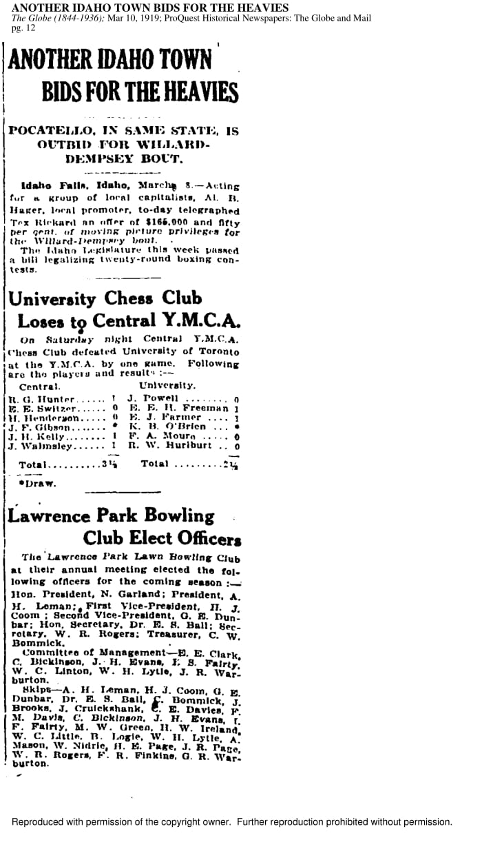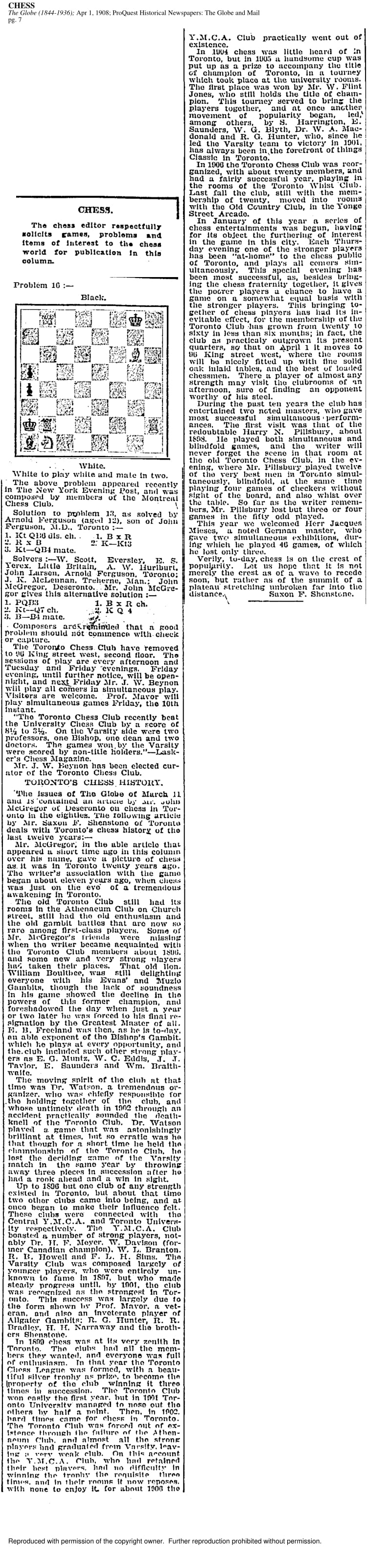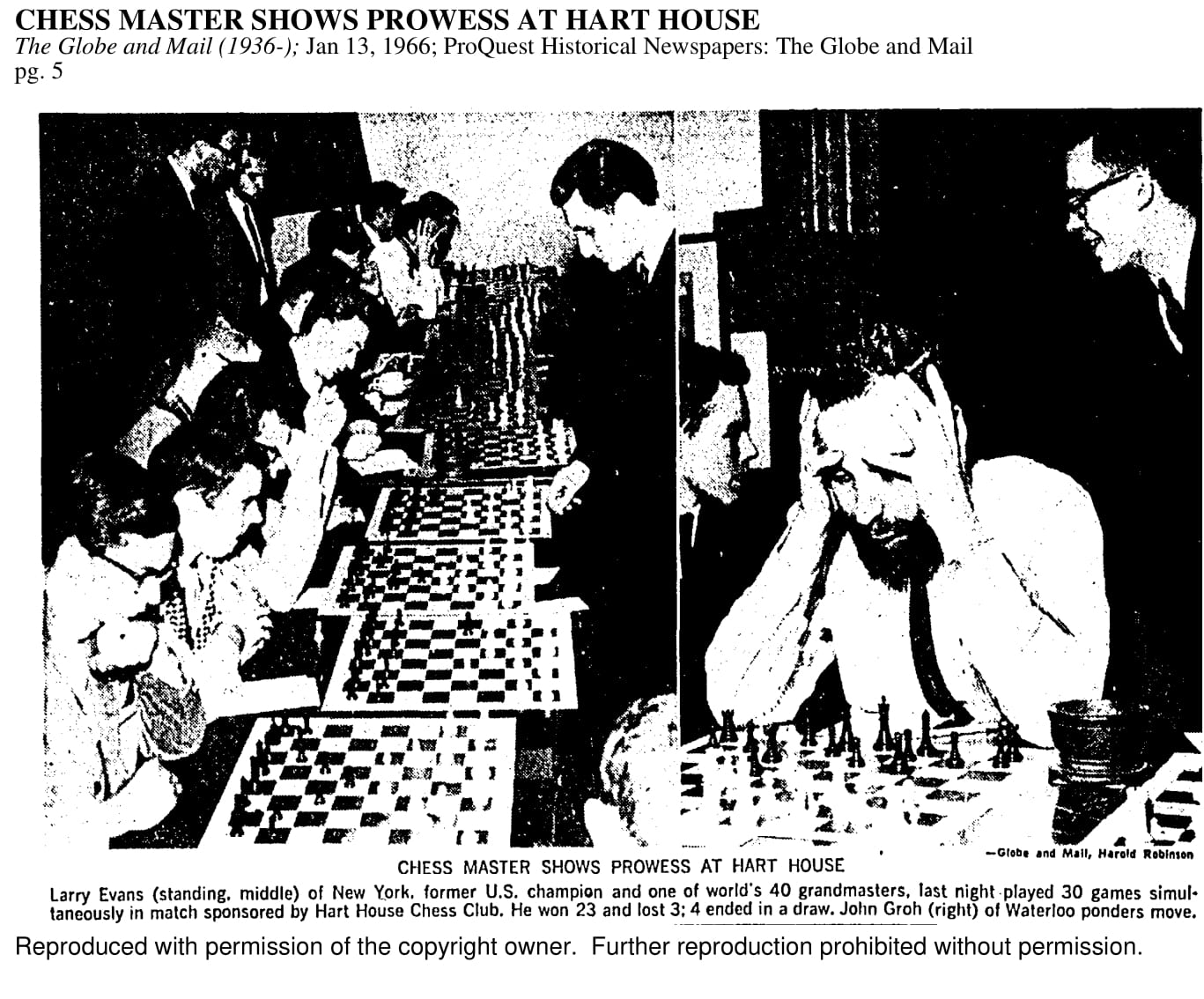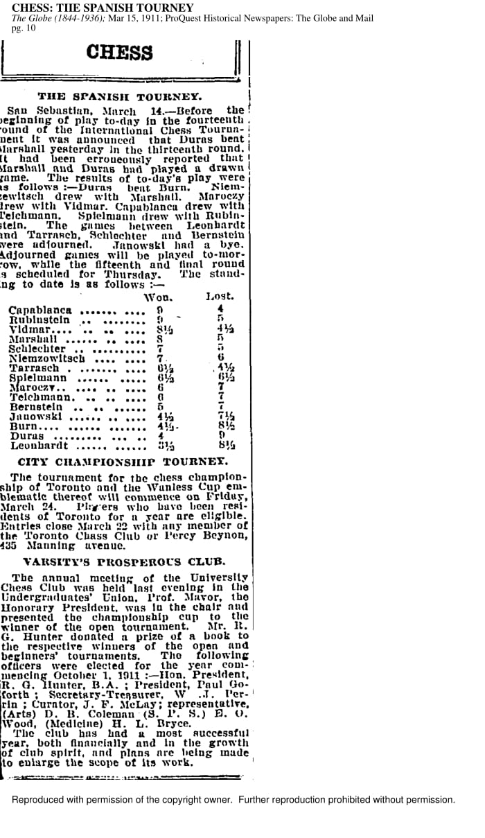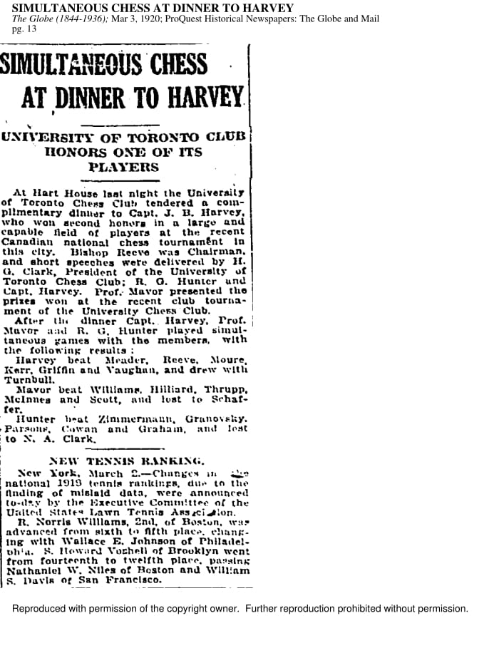 The Hart House Chess Club has been featured by major Toronto newspapers ever since its founding. In some earlier publications, the club is referred to as the University Chess Club. The following newspaper examples come from the Toronto Star / Toronto Daily Star archives and the Globe and Mail archives.