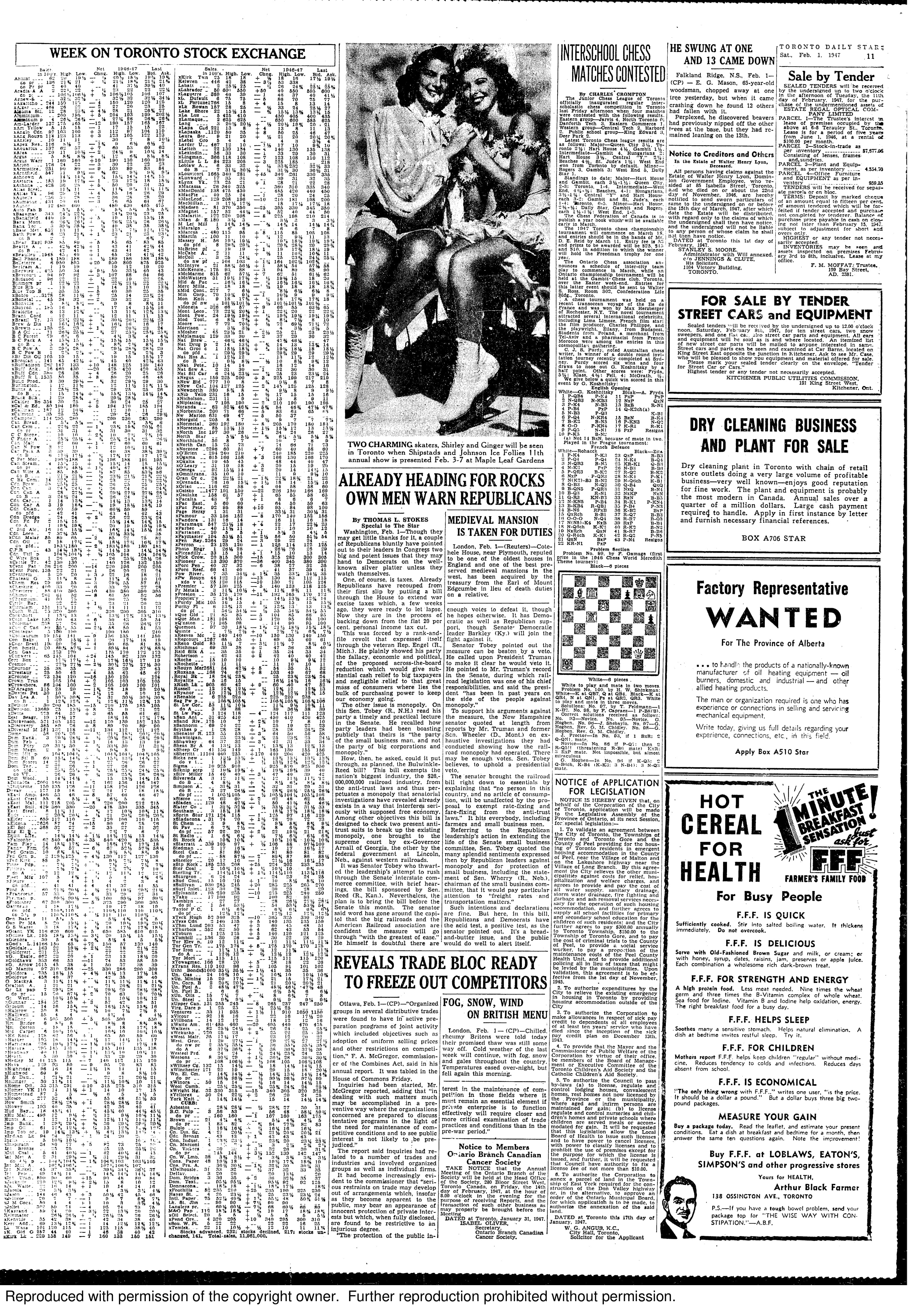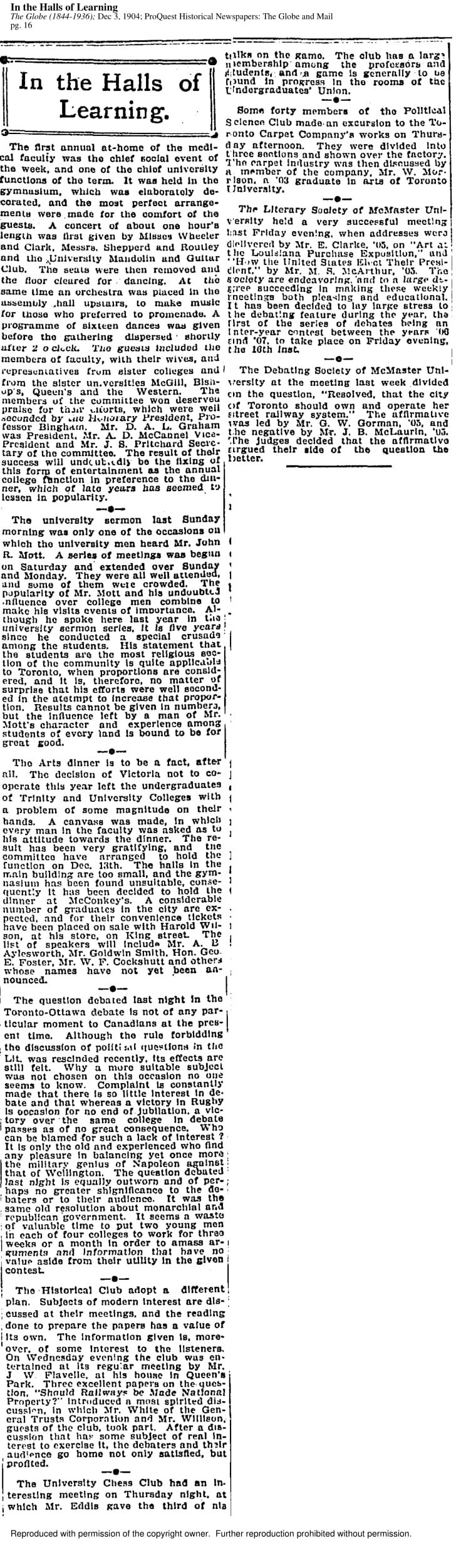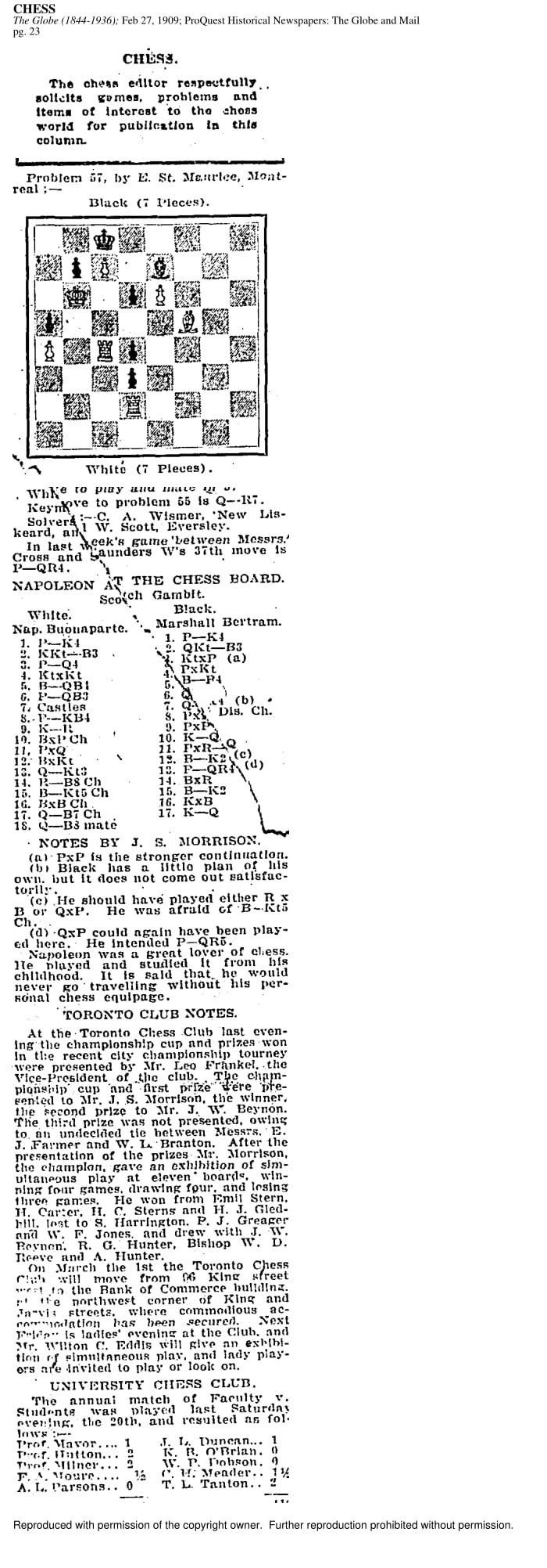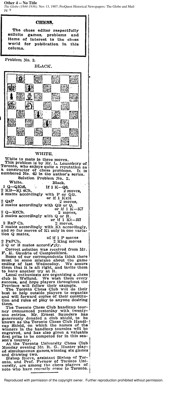 The Hart House Chess Club has been featured by major Toronto newspapers ever since its founding. In some earlier publications, the club is referred to as the University Chess Club. The following newspaper examples come from the Toronto Star / Toronto Daily Star archives and the Globe and Mail archives.