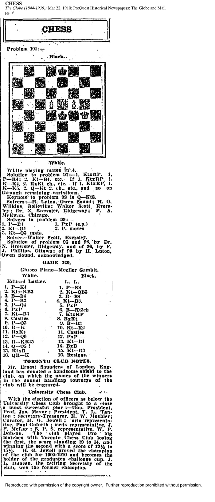 For over 125 years, the Hart House Chess Club has been the University’s main source of chess. The Club has also been one of the leading Clubs in the GTA, winning numerous league titles and featuring in numerous articles and publications across the decades. Most early information on the club is through physical copies and photographs; however, some digital information listed below is available on the web.